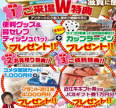 【滋賀対象エリア】滋賀県 東近江市(旧八日市市、永源寺町、五個荘町、愛東町、湖東町、能登川町、蒲生町)、野洲市(旧中主町、野洲町) 、大津市、湖南市、栗東市、守山市、甲賀市、長浜市、近江八幡市、日野町、竜王町、彦根市、愛荘町(旧秦荘町、愛知川町)・豊郷町・甲良町・多賀町